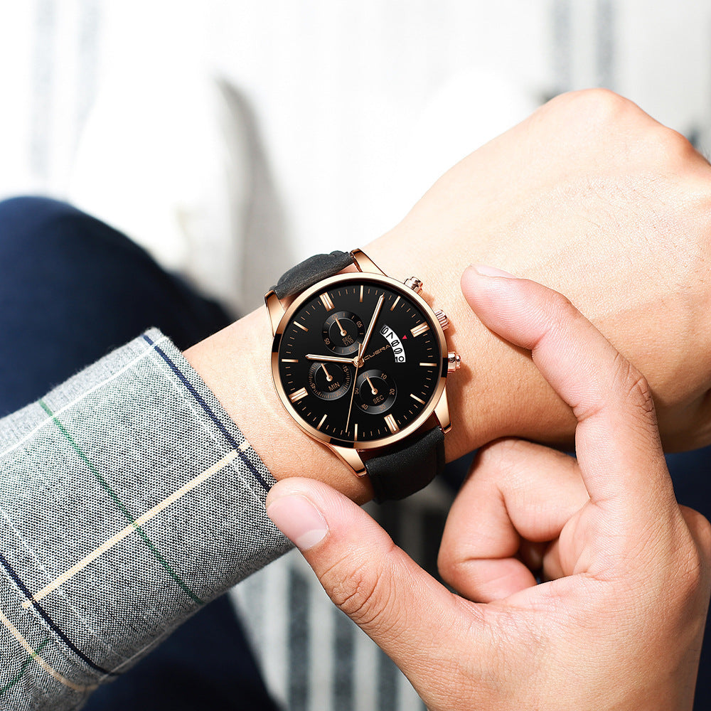 Men’s Business Quartz Watch – Three-Eye Calendar, 41.5mm Round Dial, Leather Strap